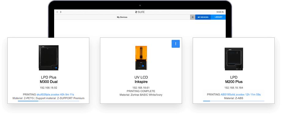 Z-SUITE es un centro de comando inalámbrico de impresoras 3D Zortrax inteligentes y confiables con capacidad de Wi-Fi. Simplemente conecte todos los dispositivos a una granja de impresión 3D y comience a trabajar de manera más eficiente.